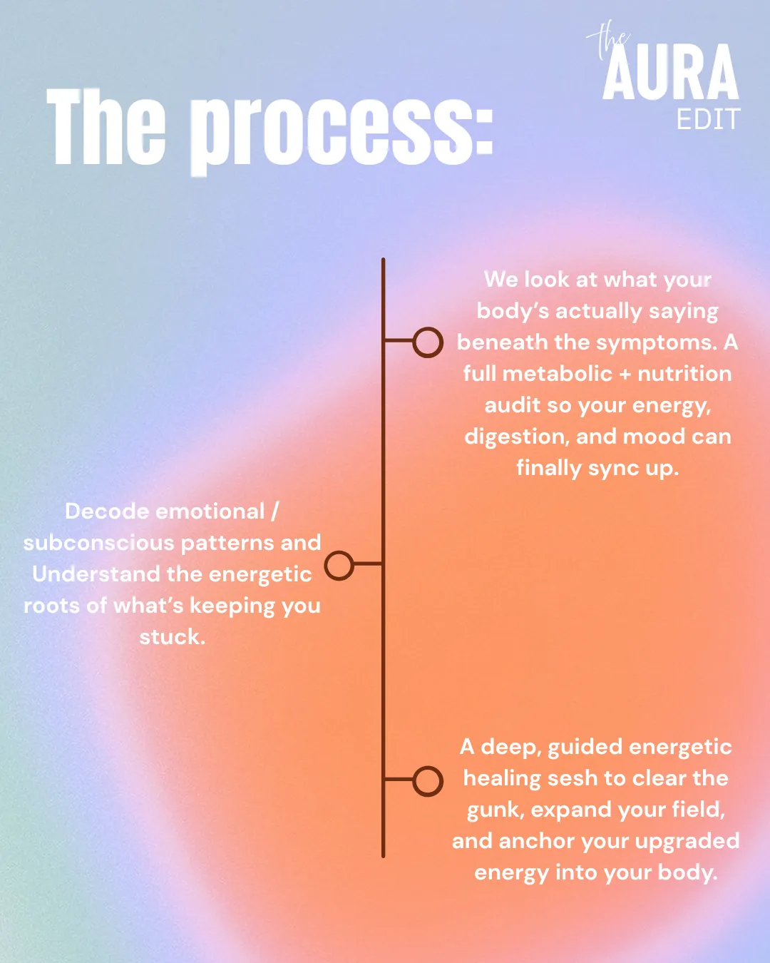 The Aura Edit focuses on your energetic operating system — the subconscious patterns, nervous system conditioning, and energetic imprints that keep you in cycles you can’t think your way out of.